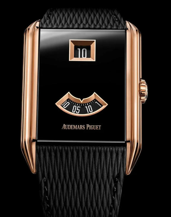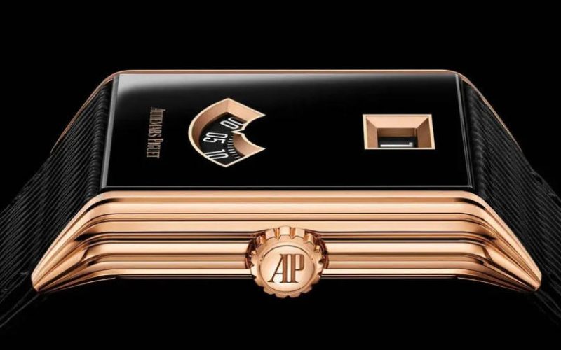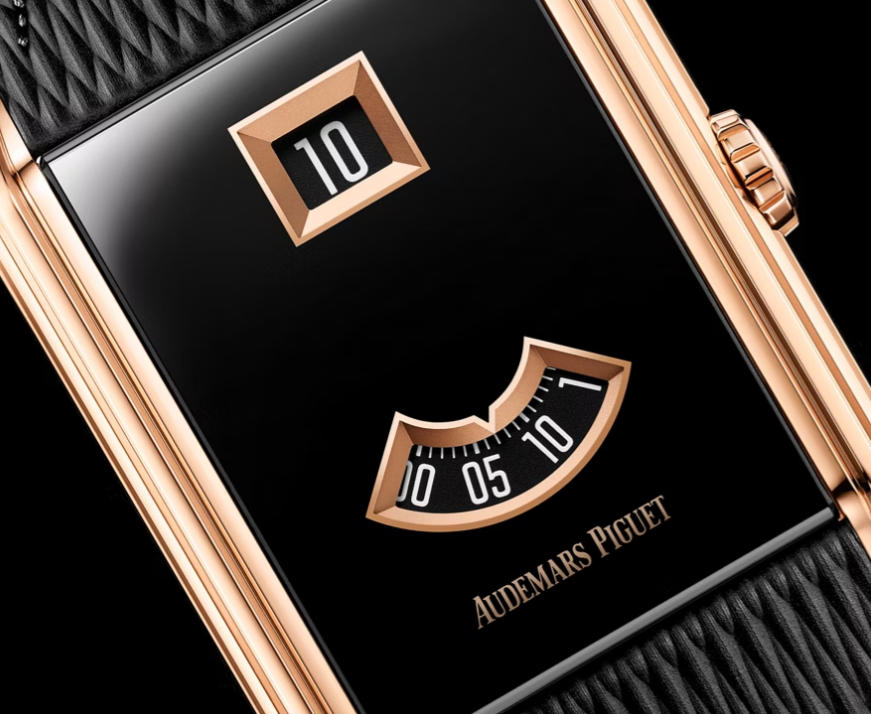 It’s a marvel of Art Deco design, with a rectangular case in pink gold with stepped sides – which Audemars Piguet describes as vertical gadroons – eight to a side. The black PVD-treated sapphire crystal, is broken by two gold-framed apertures that display hour and minute numerals. It was inspired by the UK top replica watches from 1929, which in turn was inspired by Streamline Moderne movement, also known as Pacquebot or Ocean Liner style – a late branch of Art Deco, says Audemars Piguet. The look was all about minimalism, taking cues from the aerodynamic forms of trains and ships, symbols of speed and modernity at the time. Today, it’s a lovely look that leans into the sleek, minimalist aesthetic so popular for the past five years, and collectors’ love of shaped cases (a departure from round).